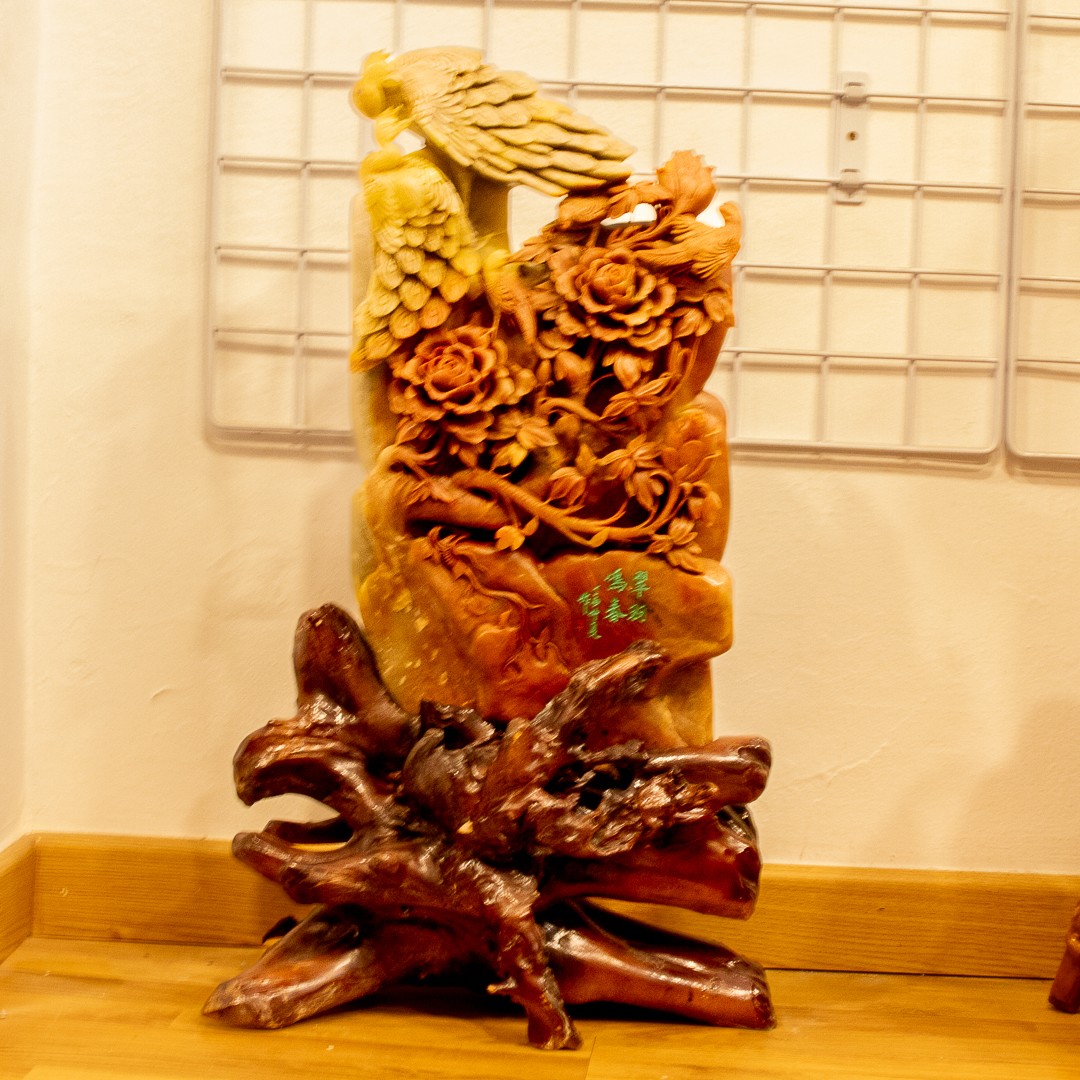 Escultura China hecho sobre Piedra de Jabón con peana tallada en madera de mediados del siglo XX. Medidas generales: 77x42 Cm
